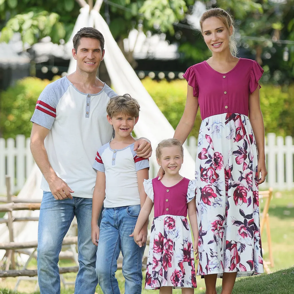 Family Matching Solid Fuschia Short-sleeve Floral Print Dresses & T-shirts Sets