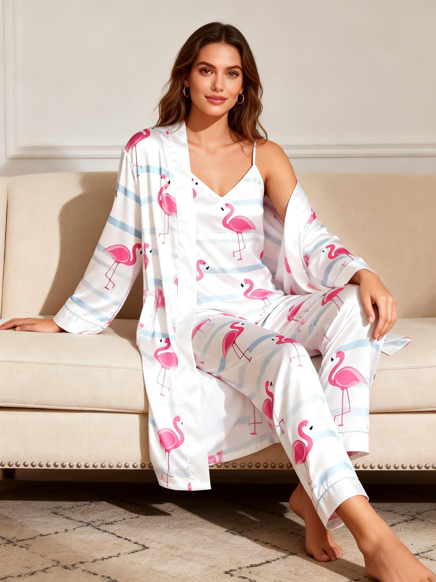 Women’s Luxury Nightwear – Satin Robe, Cami, Pants with Flamingo Pattern